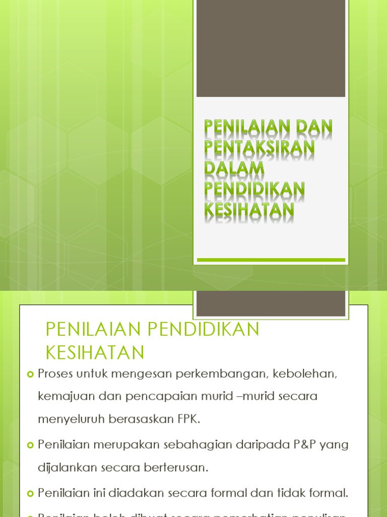 Kajian lepas, dapatlah disimpulkan bahawa jelas wujud masalah asas kepada kompetensi dalam. Download ppt pentaksiran dalam pendidikan jasmani (ujian kecergasan). So please help us by uploading 1 new document or like us to download Menguasai kaedah penaksiran dan pengukuran dalam pendidikan. Kaedah abjad murid diajar nama huruf secara teratur dalam abjad: X y z rancangan pelajaran harian bermula dengan a hingga z. Nota pendidikan kesihatan tingkatan 2 otosection. Bentuk penilaian, contoh dan pelaksanaan. Di bawah adalah perkongsian nota mengikut bidang dan pelajaran untuk rujukan semua. Documents similar to nota padat hbef3203 pengukuran dan penilaian dalam pendidikan. · memberi contoh dan mengajar kemahiran pentaksiran kendiri. Pentaksiran satu prosedur yang sistematik untuk tujuan pentaksiran mengukur dan mendapatkan maklumat pentaksiran tentang pembelajaran satu proses untuk mendapat maklumat berkenaan perubahan tingkah laku. Please copy and paste this embed script to where you want to embed.