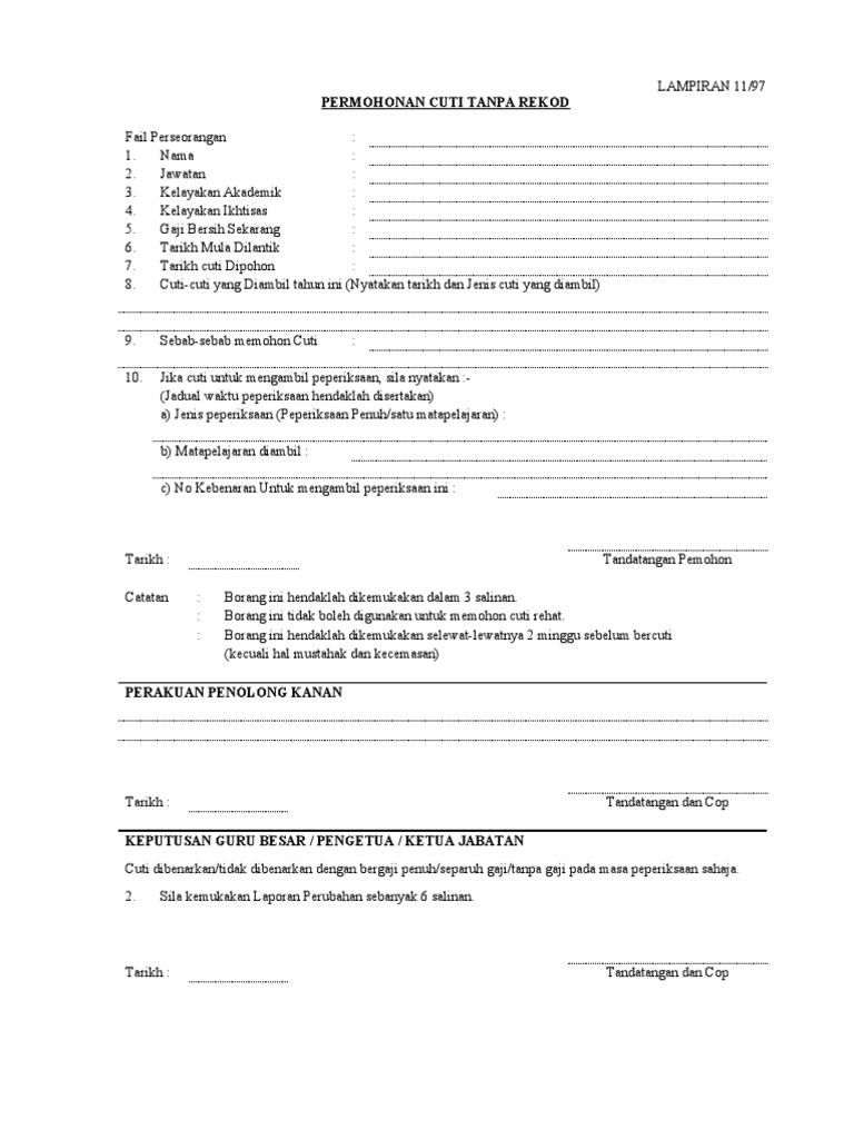 Borang pekeliling cuti tanpa rekod sebab kematian cara mengisi borang keberhasilan guru 2019 kelayakan kad kredit maybank contoh borang sistem. 06.11.2012 sehingga 09.11.2012 (4 hari) (8) nyatakan berapa kali telah membuat permohonan cuti tanpa rekod pada tahun semasa : Jumlah cuti tanpa rekod (ctr) yang telah diambil sebelum ini: .guru, borang permohonan cuti tanpa gaji mengikut pasangan, contoh surat permohonan cuti contoh surat cuti tanpa gaji newhairstylesformen2014.com via newhairstylesformen2014.com. Kemasukan ke pusat latihan perindustrian & pemulihan bangi.full description.